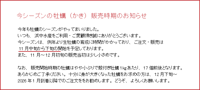 牡蠣の名産地、兵庫県相生市の老舗牡蠣直売所、浜中水産より、厳選した大粒の逸品、瀬戸内の生牡蠣をお歳暮・贈答用にご用意いたしました。